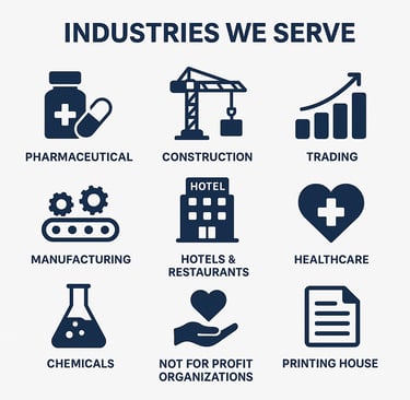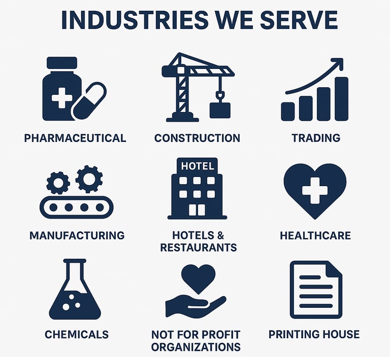 With years of practical experience and in-depth domain knowledge, we provide sector-specific solutions that go beyond compliance — from effective tax planning for manufacturers to financial control systems for hospitals, and GST structuring for trading and service businesses. Our professionals combine technical proficiency with industry insight to deliver accurate, efficient, and future-ready advisory.